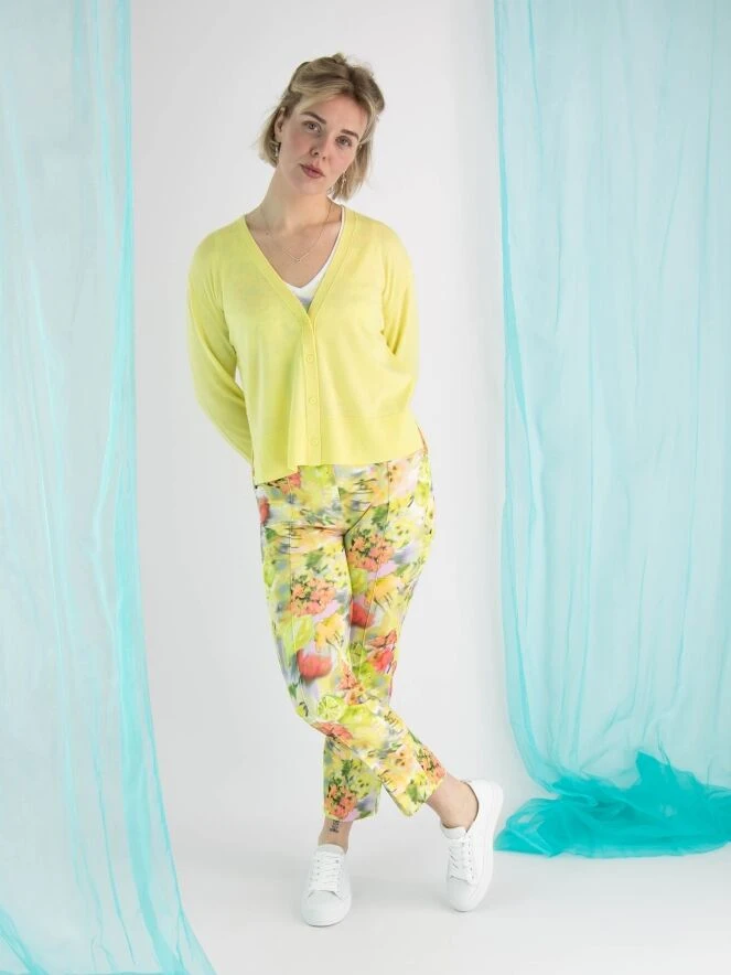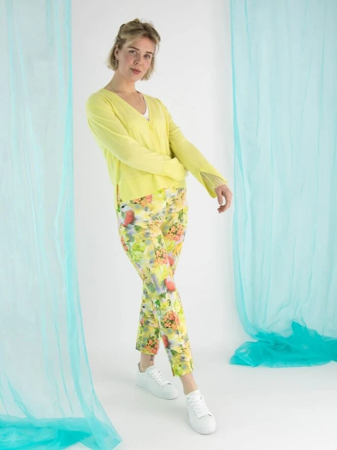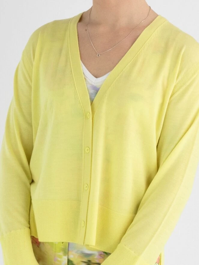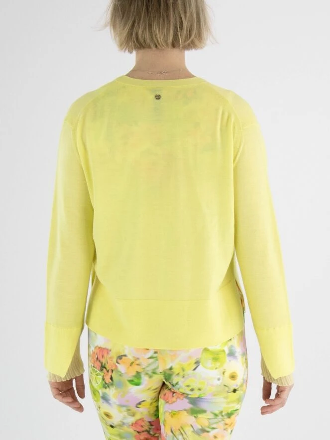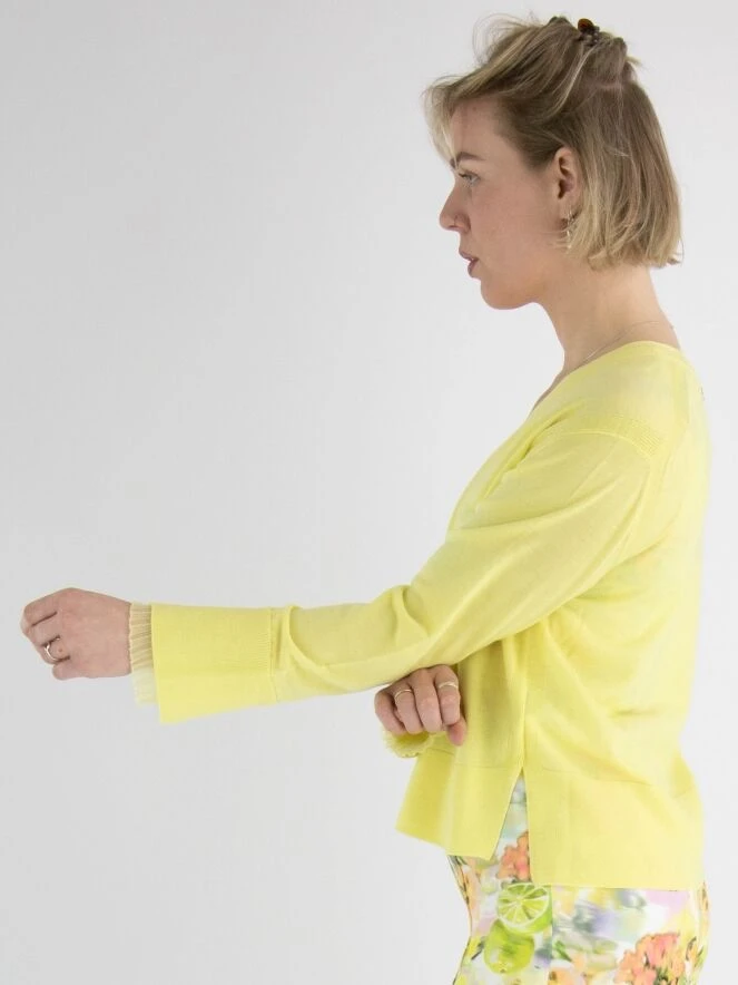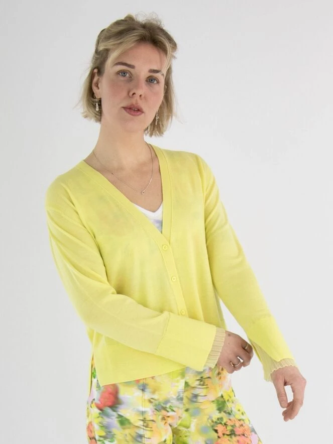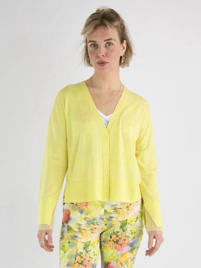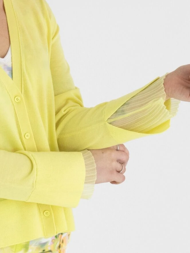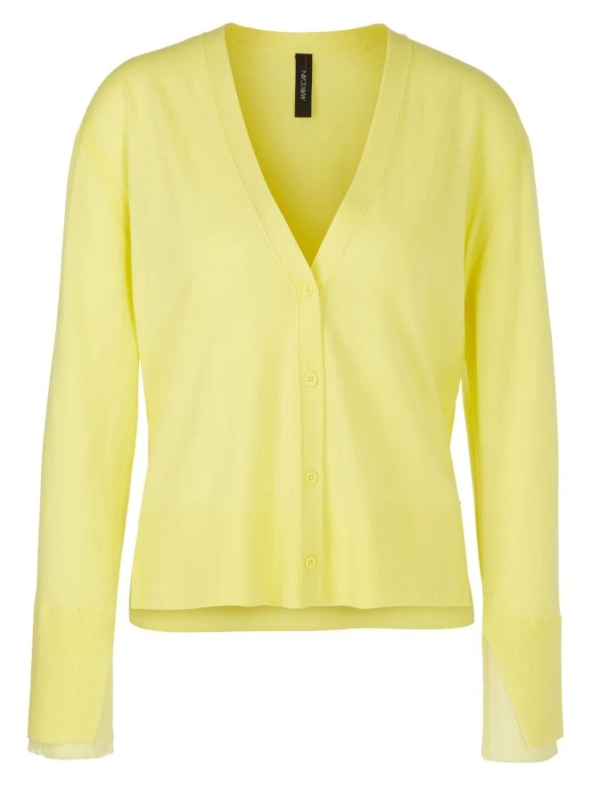 Eine Strickjacke von Marc Cain in einer sanften gelben Farbe. Am unteren Ende der Ärmel befindet sich ein breiter, fein gerippter Bündchen. Am Ende der Ärmel gibt es auch einen tiefen Schlitz, der mit einem leicht transparenten und fein plissierten Crepe-Stoff gefüllt ist. Diese Strickjacke kann von Hand gewaschen werden.