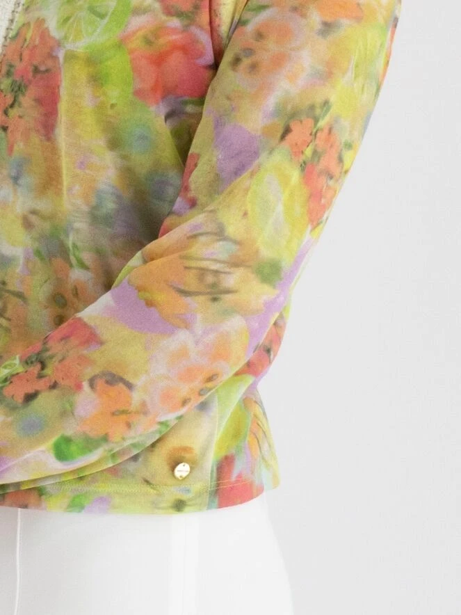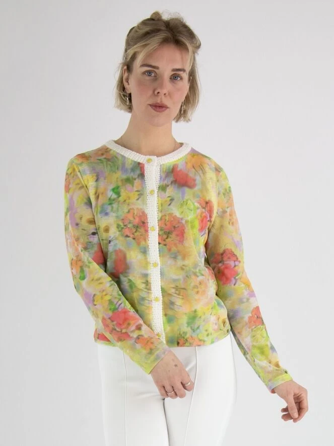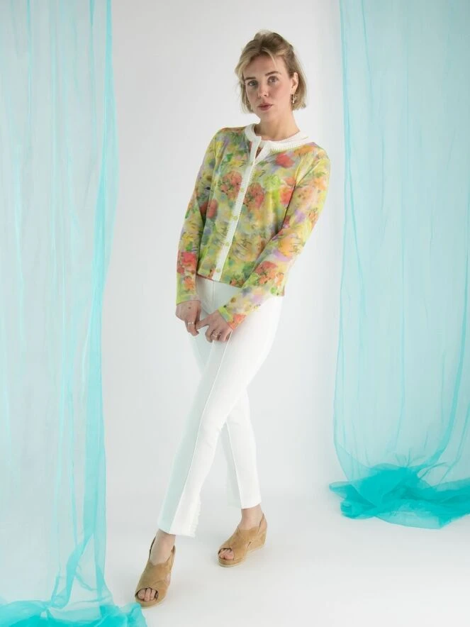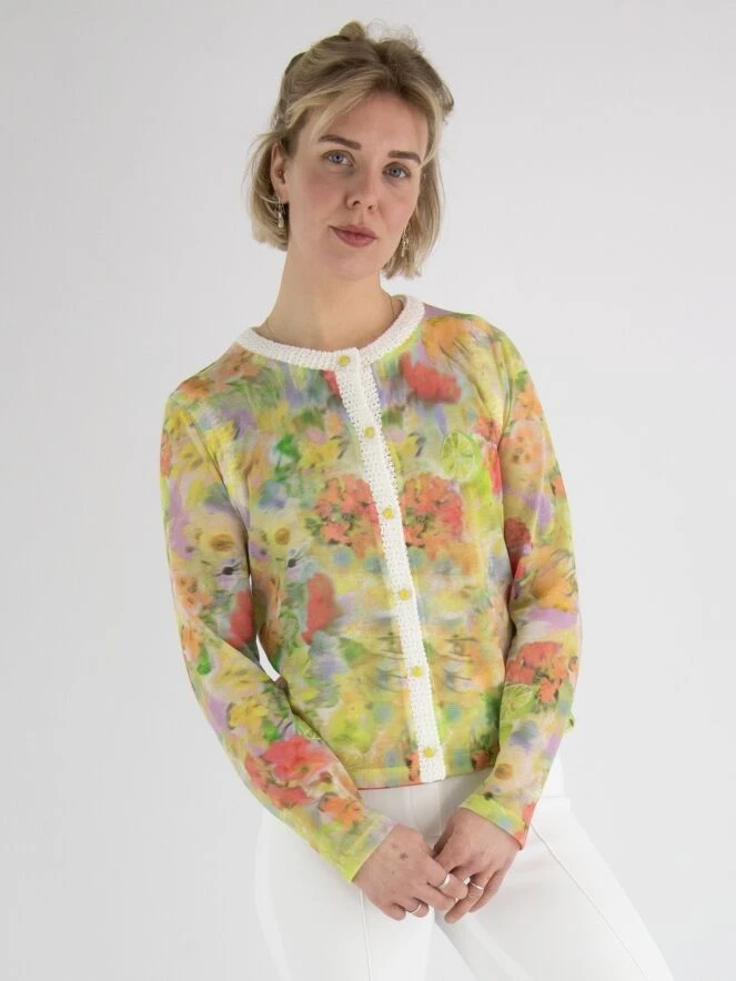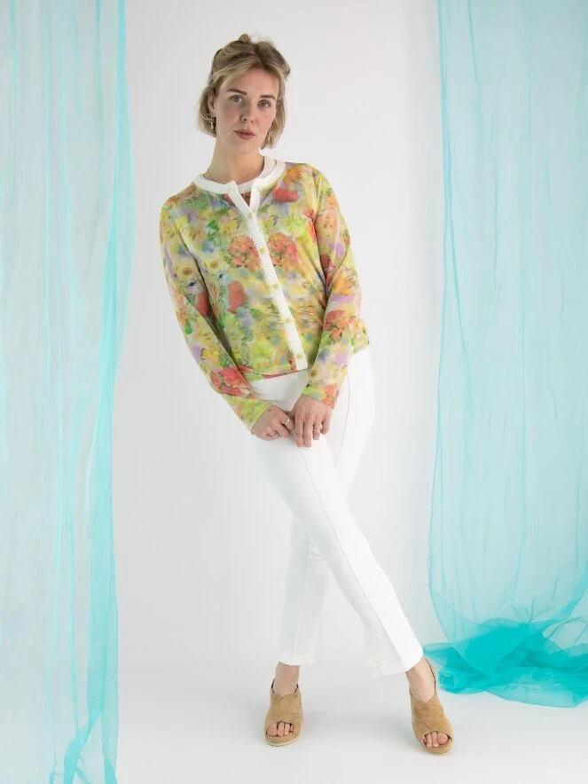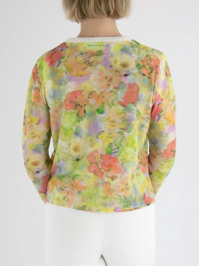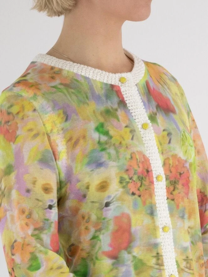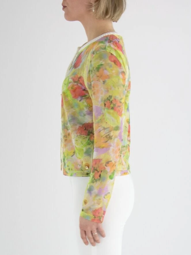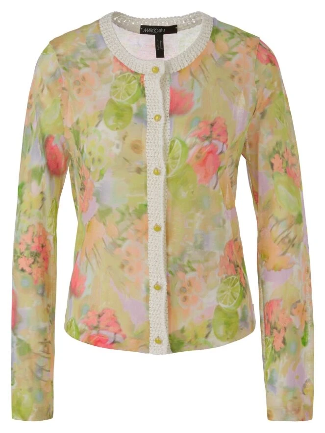 Ein leicht transparenter Cardigan von Marc Cain mit einem Druck von Limetten mit Blumen in mehreren Gelb-, Grün- und Korallenrot-Tönen. Entlang des Randes des Rundhalsausschnitts und des Knopfverschlusses gibt es eine gehäkelte weiße Borte. Dieser Cardigan kann bei 30 Grad gewaschen werden.