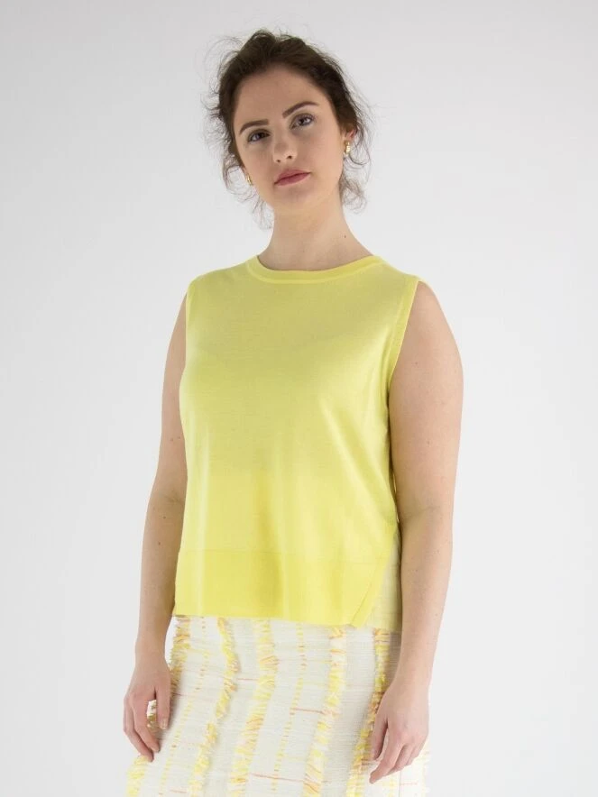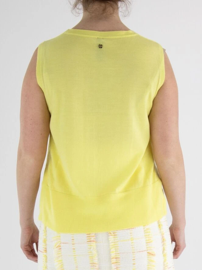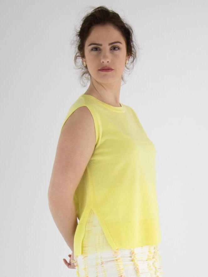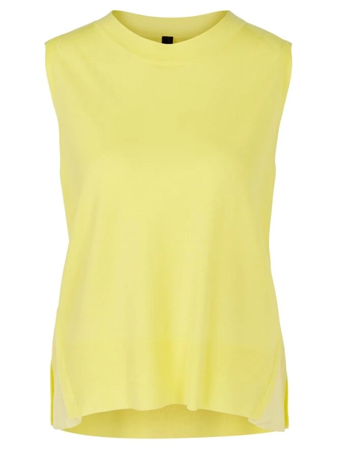 Ein Top von Marc Cain in einer zarten gelben Farbe. Das Top hat einen runden Ausschnitt, und unten befindet sich ein breiter, fein gerippter Saum. Die Seiten haben unten einen tiefen Schlitz, der mit einem fein plissierten Voile-Crêpe-Stoff gefüllt ist. Dieses Top kann von Hand gewaschen werden.