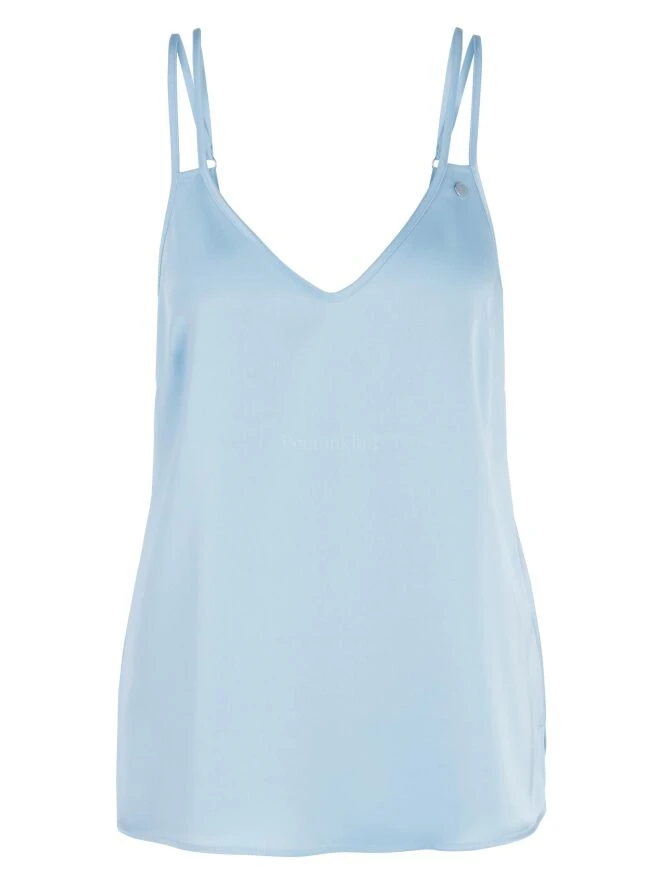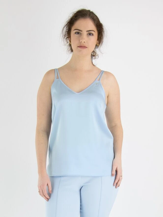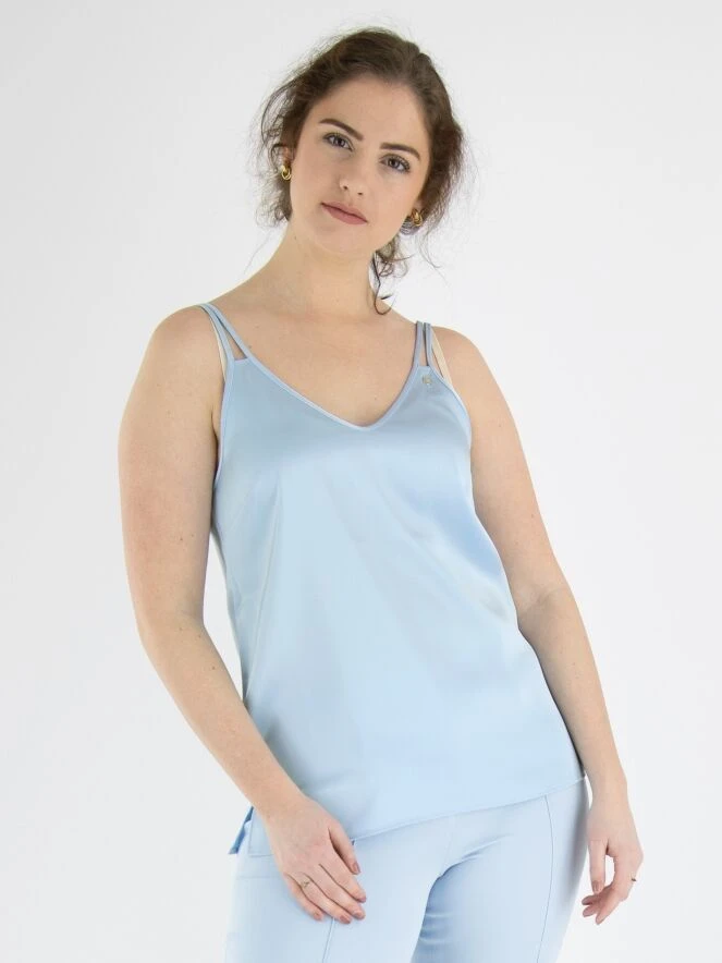 Ein matt glänzendes Top von Marc Cain in lavendelblau. Das Top hat einen V – Ausschnitt und doppelte Spaghettiträger. Dieses Top kann bei 30 Grad gewaschen werden.