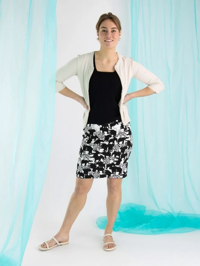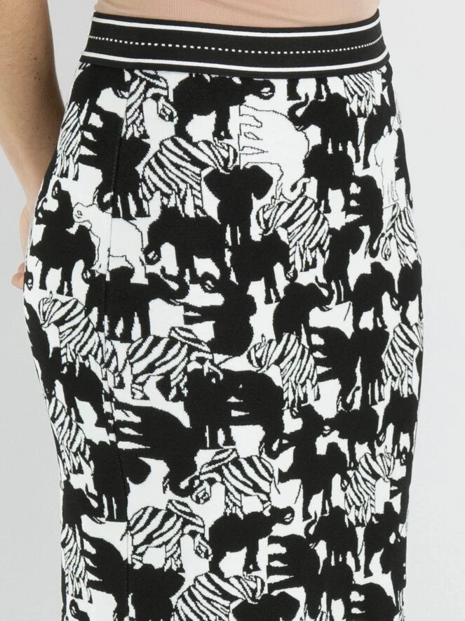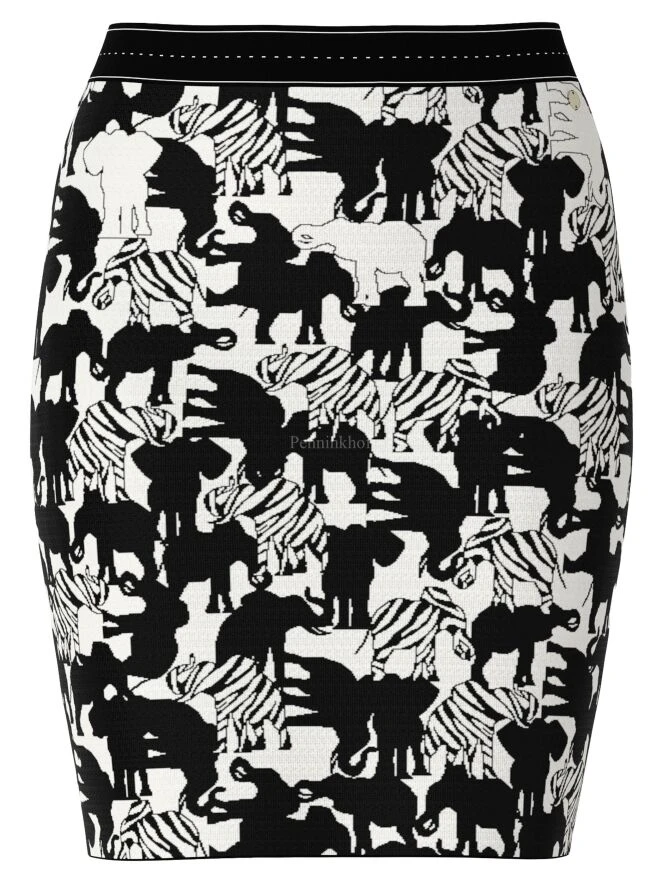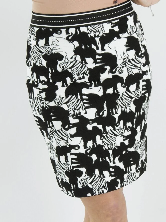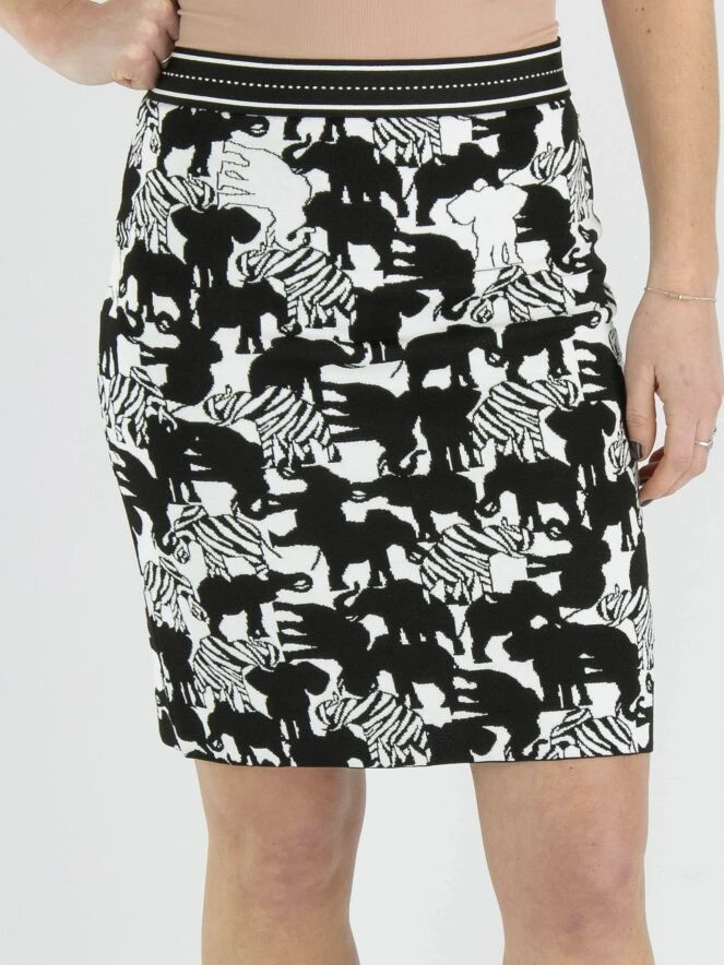 Ein Rock von Marc Cain mit einem Elefantendruck in Schwarz und Cremeweiß. Der Bund ist elastisch und in einem Streifenmuster. Der Rock ist gefüttert und kann bei 30 Grad gewaschen werden.