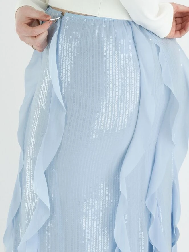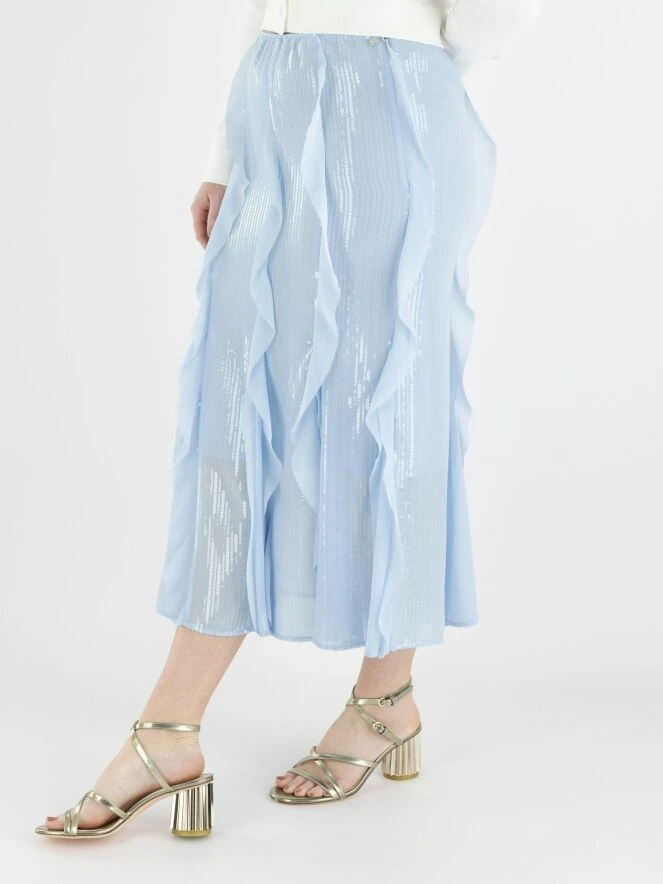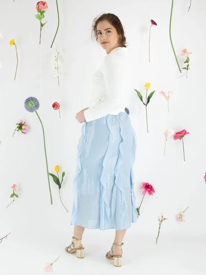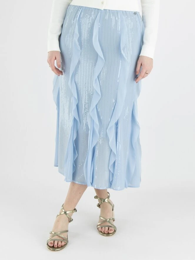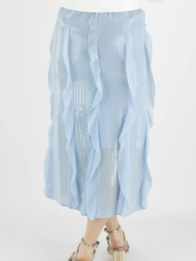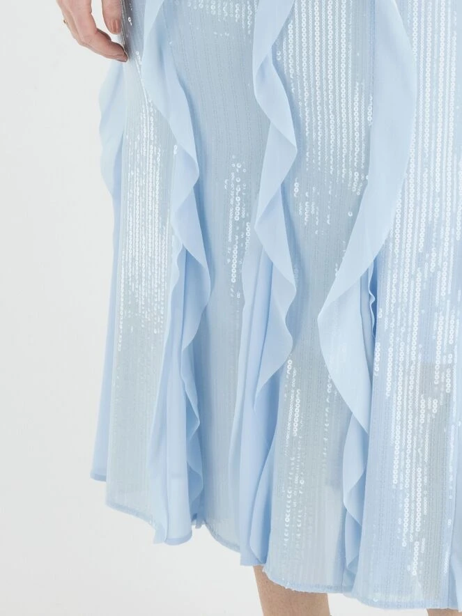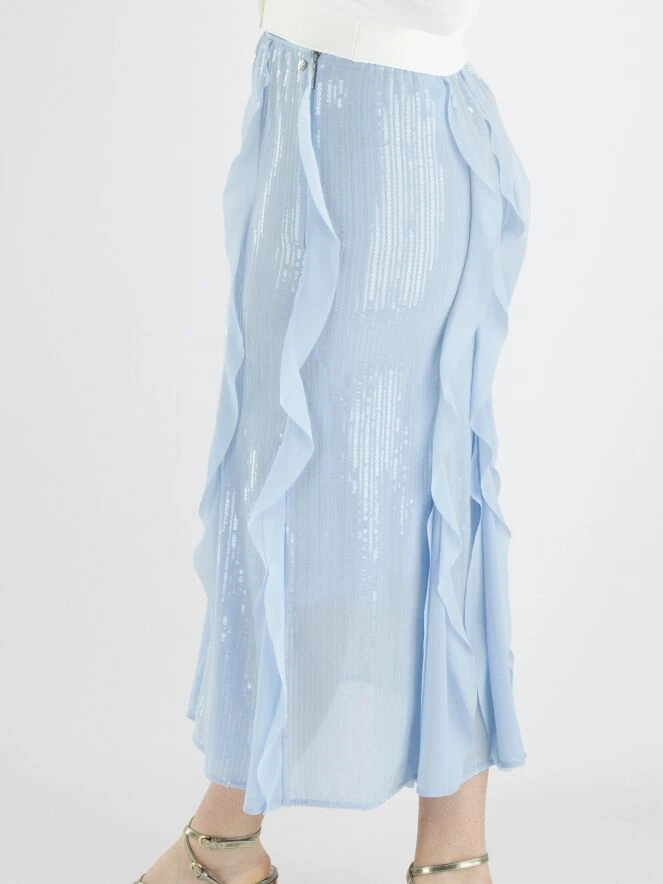 Ein Rock von Marc Cain in einer weichen lavendelblauen Farbe. Über die gesamte Oberfläche des Stoffes sind transparente Pailletten in vertikalen Linien befestigt. Der Rock hat mehrere transparente Volants über die gesamte Länge, die auch die Schlitze des Rocks unterhalb des Knies auffüllen. Der Rock ist gefüttert und links von der Mitte befindet sich ein Reißverschluss. Dieser Rock kann bei 30 Grad gewaschen werden.