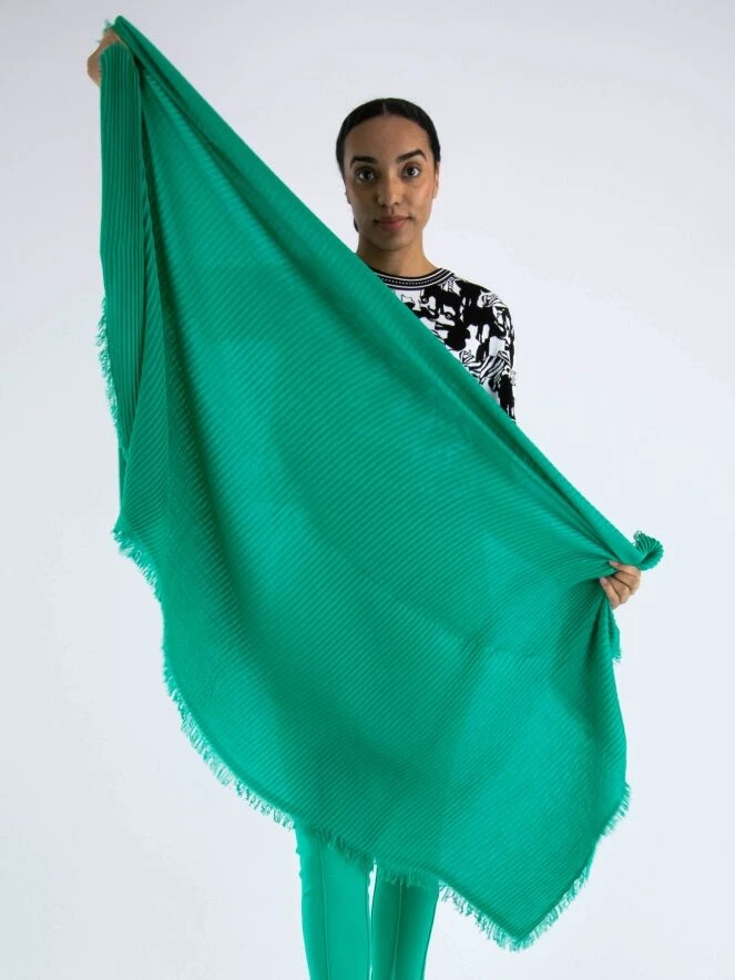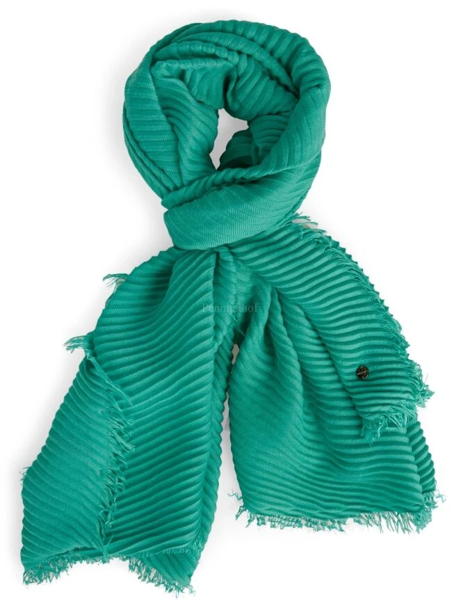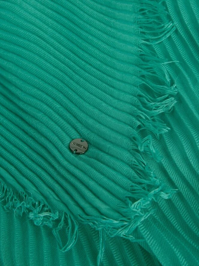 Ein gerippter Schal von Marc Cain in Türkis. Die Enden des Schals sind fein ausgefranst. Dieser Schal kann von Hand gewaschen werden.