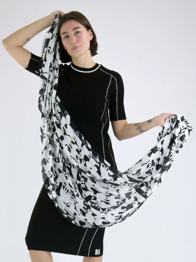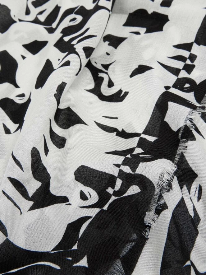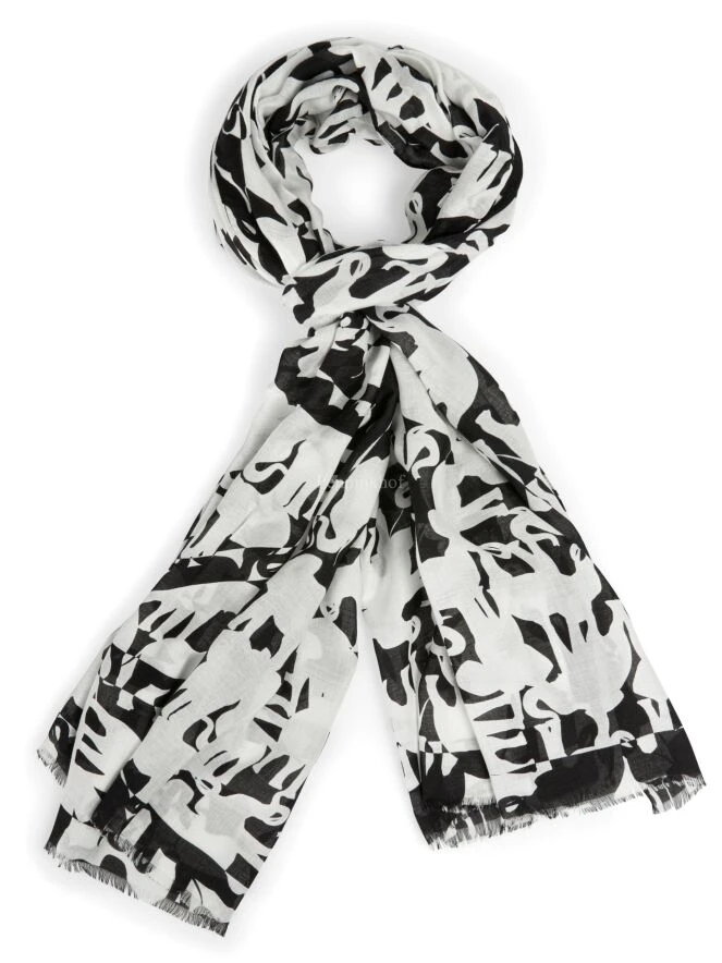 Ein luxuriöser und leicht transparenter Schal von Marc Cain mit einem grafischen Elefantenmuster in Schwarz und Weiß. Die Ränder der Enden sind fein ausgefranst. Dieser Schal kann von Hand gewaschen werden.