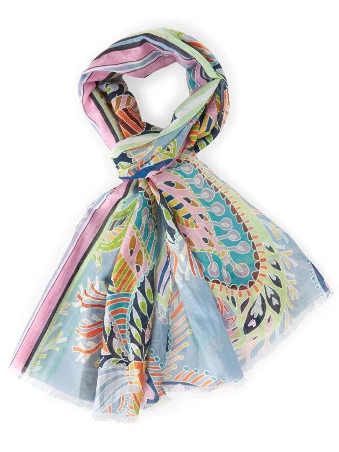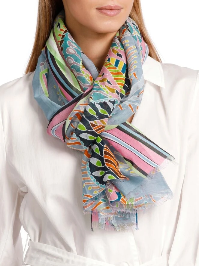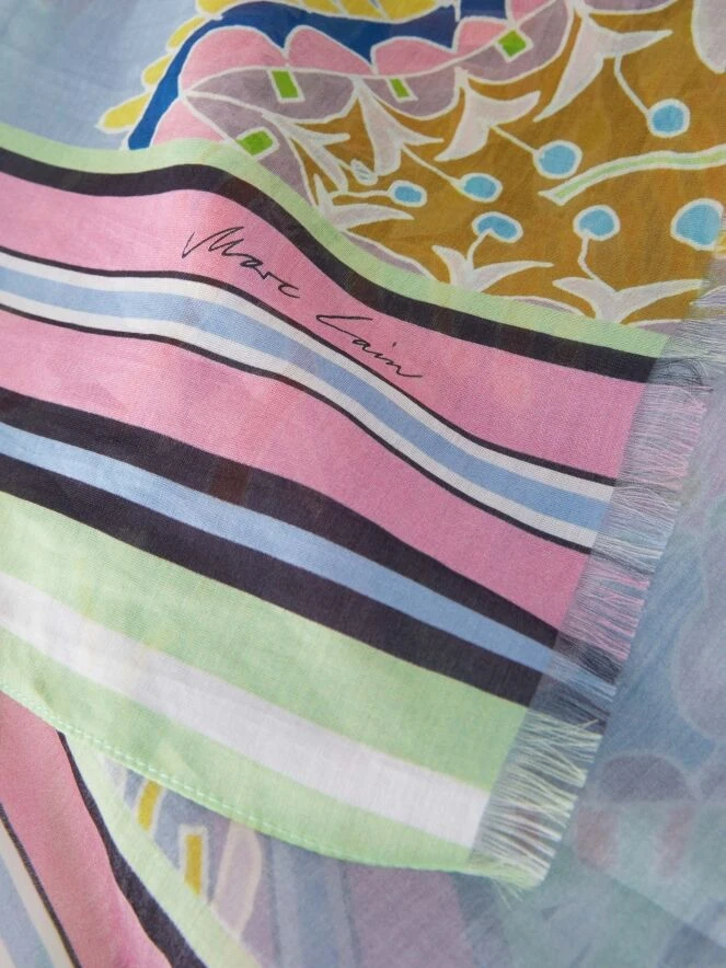 Ein leicht transparenter Schal von Marc Cain mit einem Blätterdruck in mehreren Farben auf einem lila Hintergrund. Die Enden des Schals sind fein ausgefranst. Entlang der langen Seiten des Schals befindet sich ein bedrucktes Streifenmuster in Fuchsia, Lila, Schwarz und Cremeweiß. Dieser Schal kann von Hand gewaschen werden.