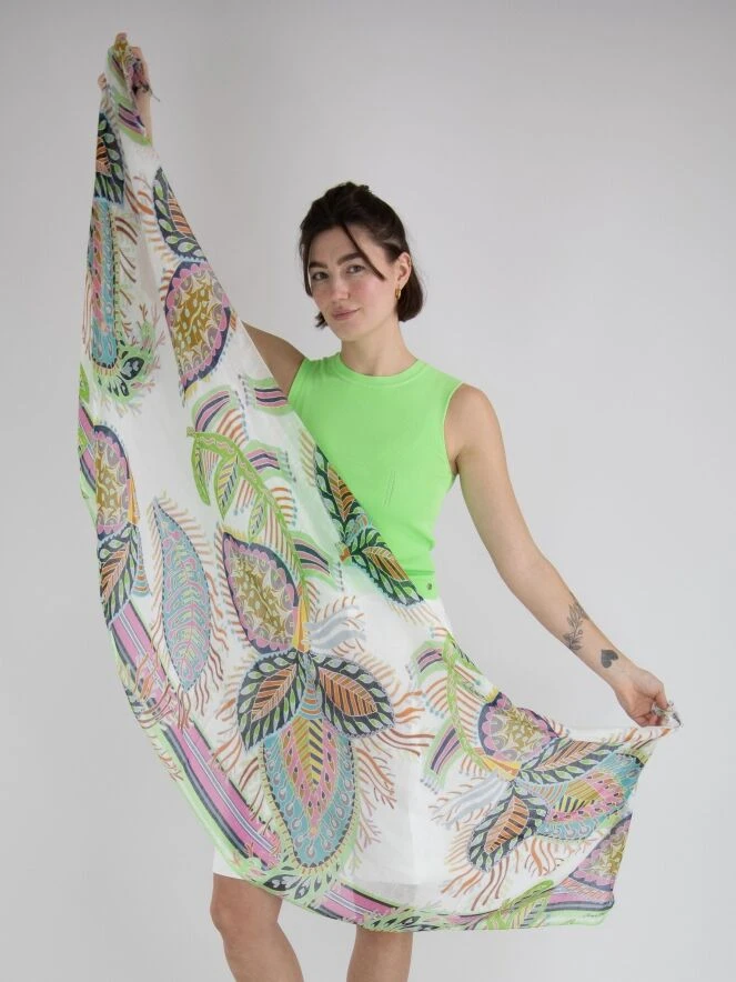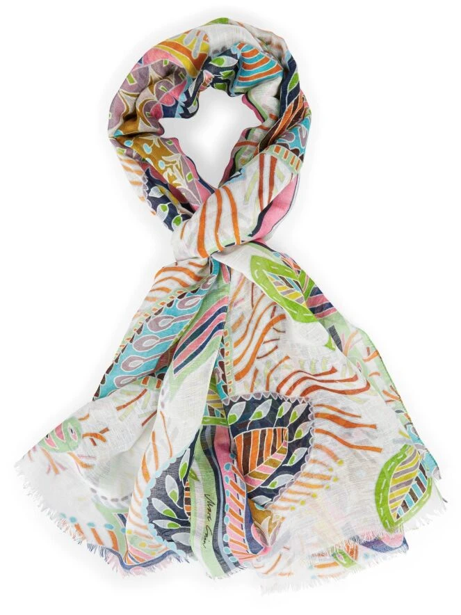 Ein leicht transparenter Schal von Marc Cain mit einem Blätterdruck in mehreren Farben auf einem cremefarbenen Hintergrund. Die Enden des Schals sind fein ausgefranst. Dieser Schal kann von Hand gewaschen werden.
