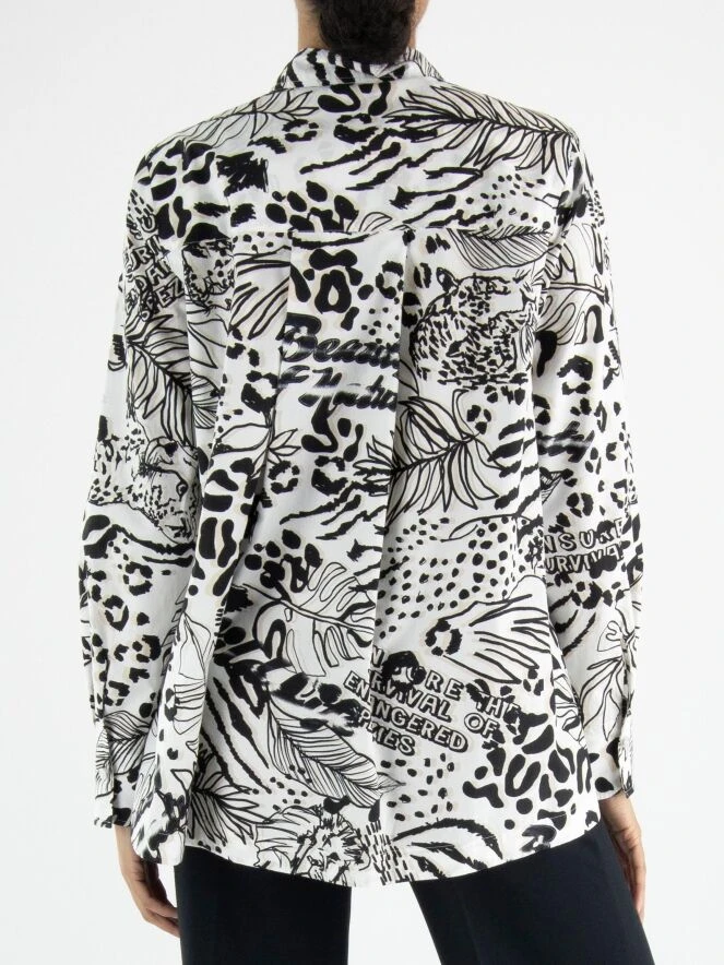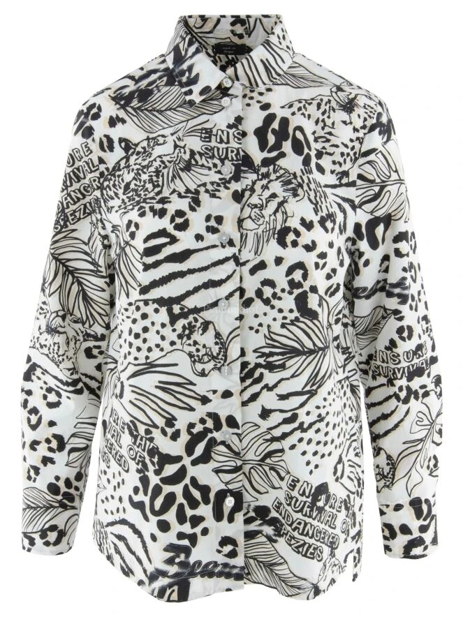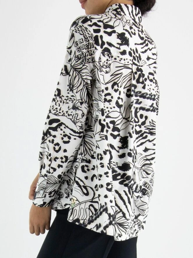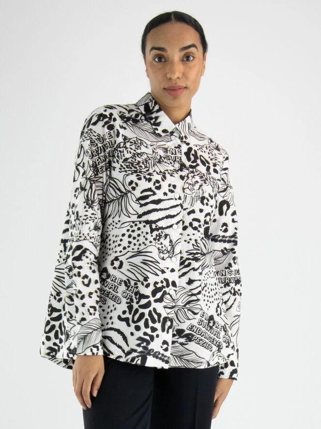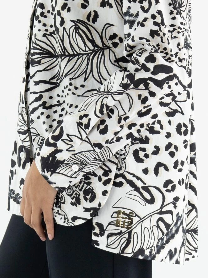 Eine Bluse von Marc Cain mit einem grafischen Muster aus Blättern und Panthern in Schwarz und Sandfarben auf einem cremeweißen Hintergrund. Die Bluse kann bei 30 Grad gewaschen werden.
