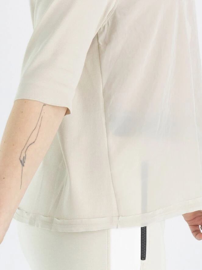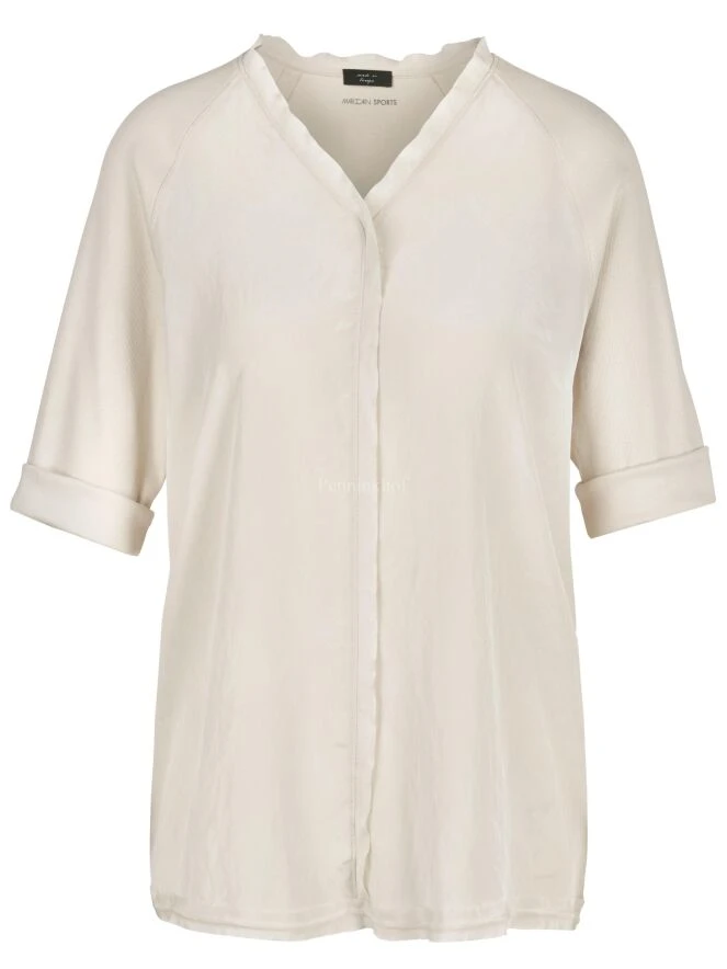 Eine Bluse von Marc Cain in Sandfarbe. Die Vorderseite ist aus mattem Satinstoff und die Rückseite aus fein geripptem Strickstoff. Von den Rändern des V-Ausschnitts verläuft eine Borte entlang der Naht in der Mitte der Vorderseite bis zum unteren Rand. Die kurzen Ärmel haben einen Umschlag. Diese Bluse kann bei 30 Grad gewaschen werden.
