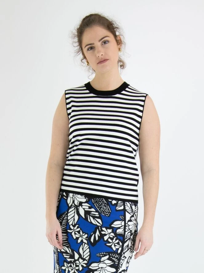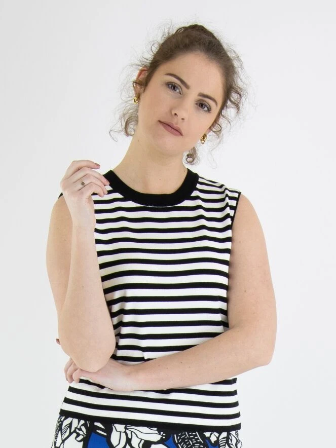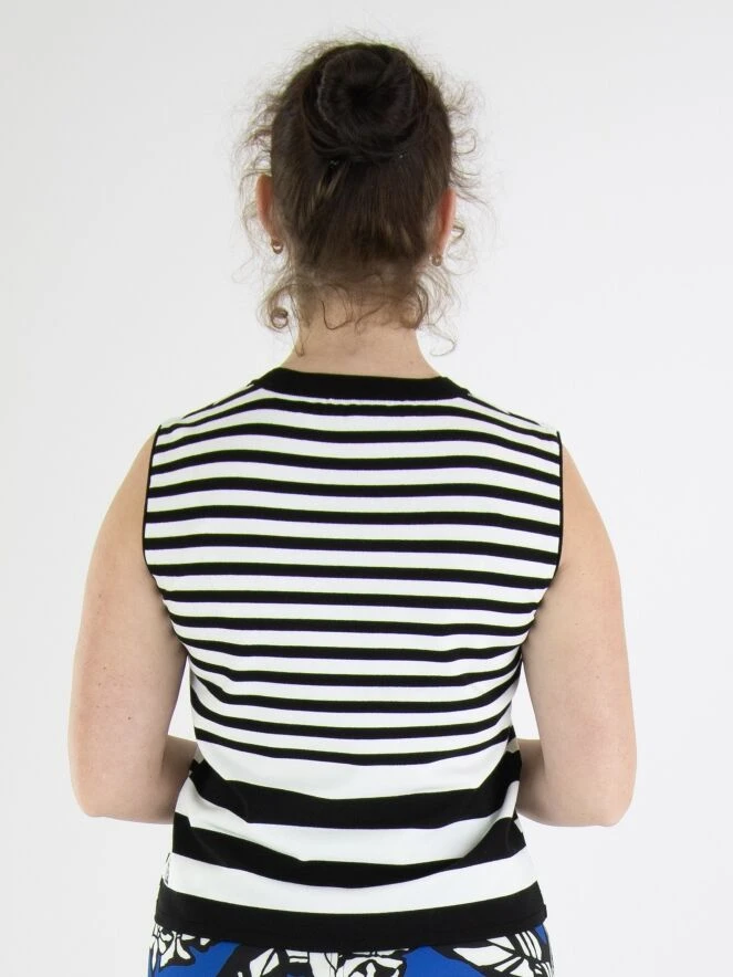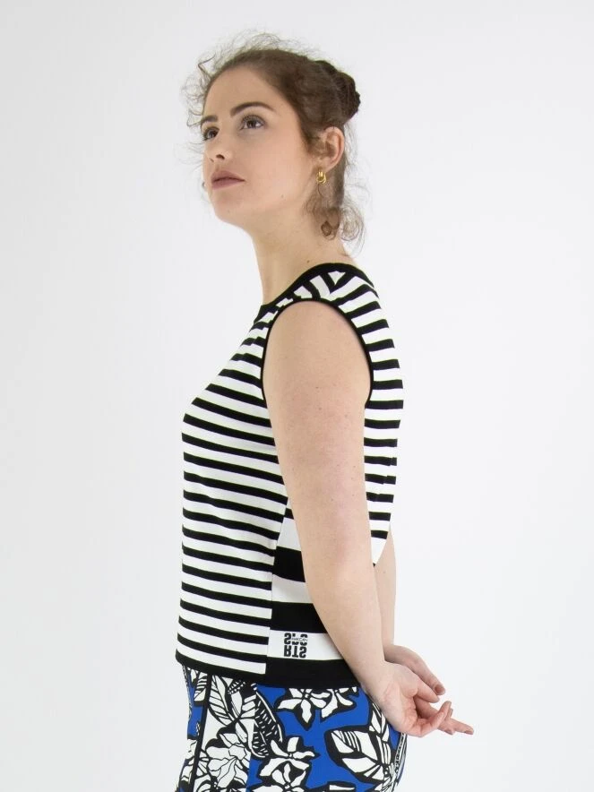 Ein Top von Marc Cain in einem gestreiften Druck in Schwarz und Weiß. Entlang des Randes des runden Ausschnitts befindet sich eine gestreifte, fein gerippte schwarze Strickborte. Dieses Top kann bei 30 Grad gewaschen werden.