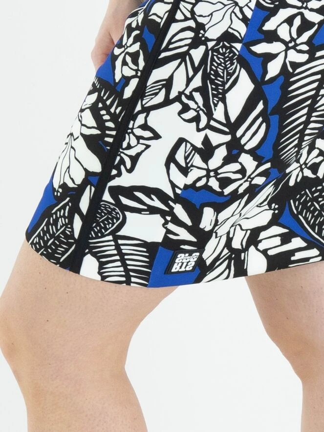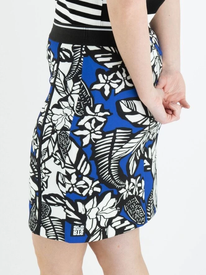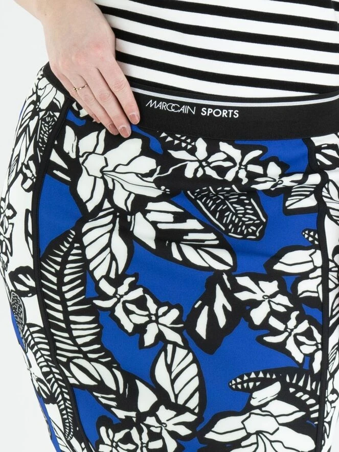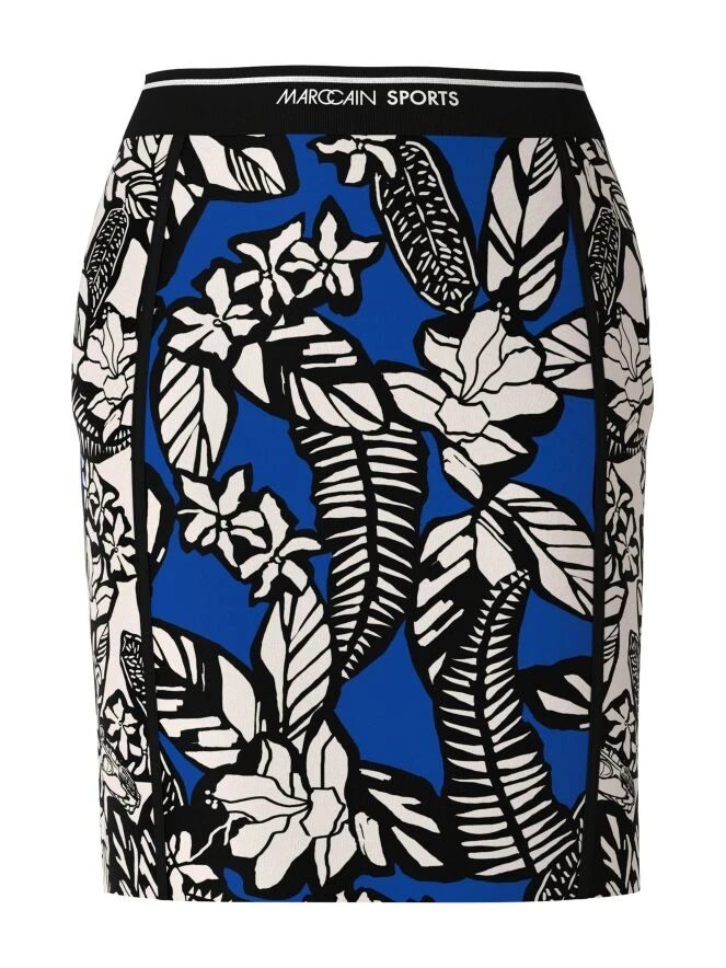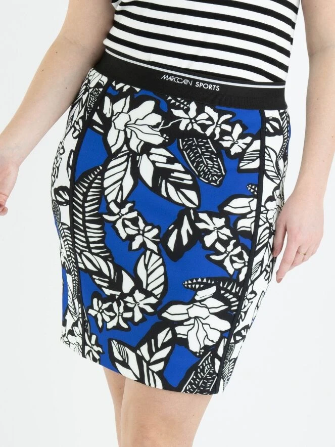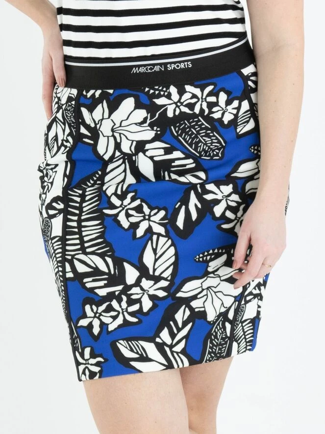 Ein Rock von Marc Cain mit einem grafischen Blumen- und Blätterdruck in den Farben Kobaltblau, Weiß und Schwarz. Der Rock hat einen elastischen Bund und ist gefüttert. Er kann bei 30 Grad gewaschen werden.