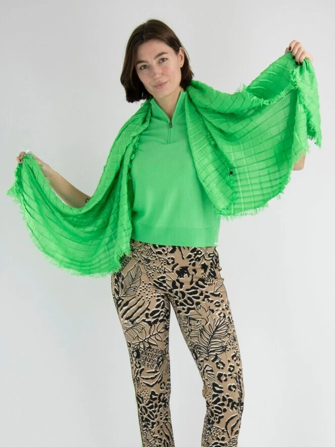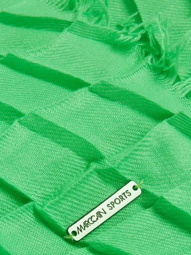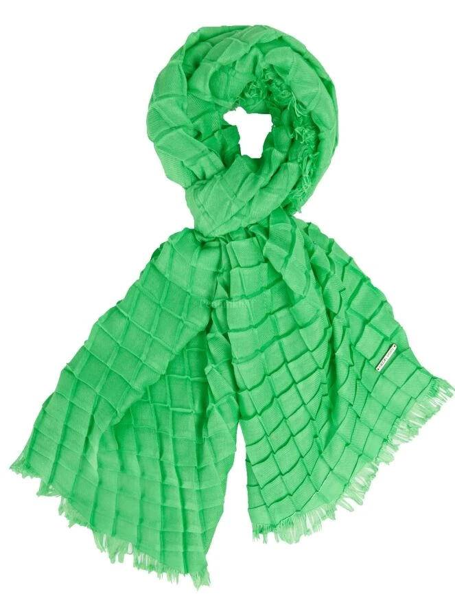 Ein Schal von Marc Cain in einem leuchtenden Grünton. Der Schal ist in einer Waffelstruktur gewebt. Die Ränder sind fein ausgefranst. Dieser Schal kann von Hand gewaschen werden.