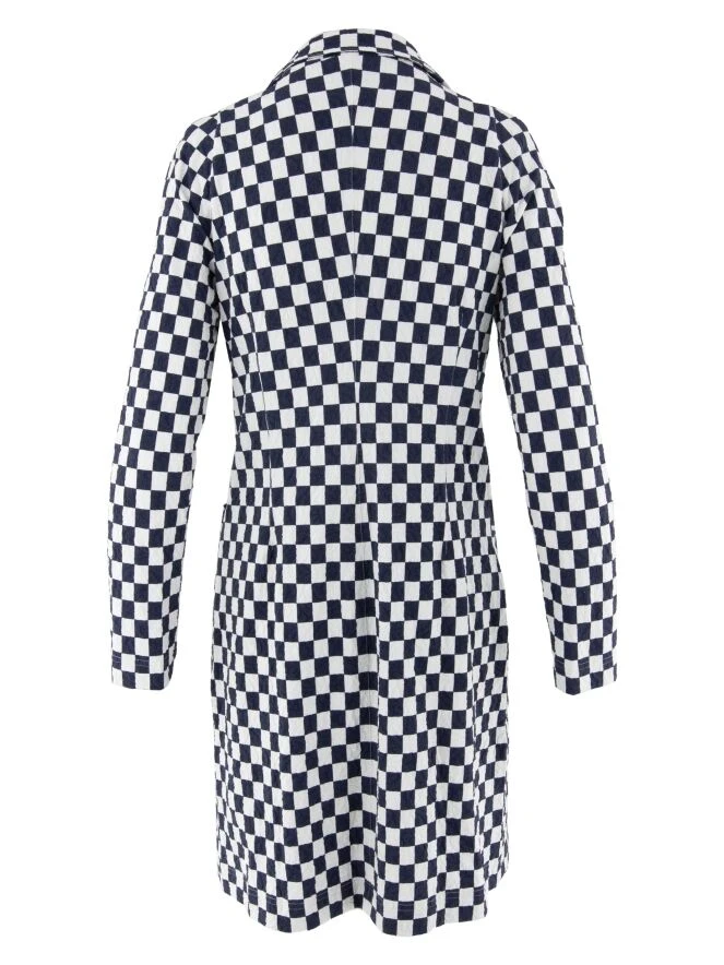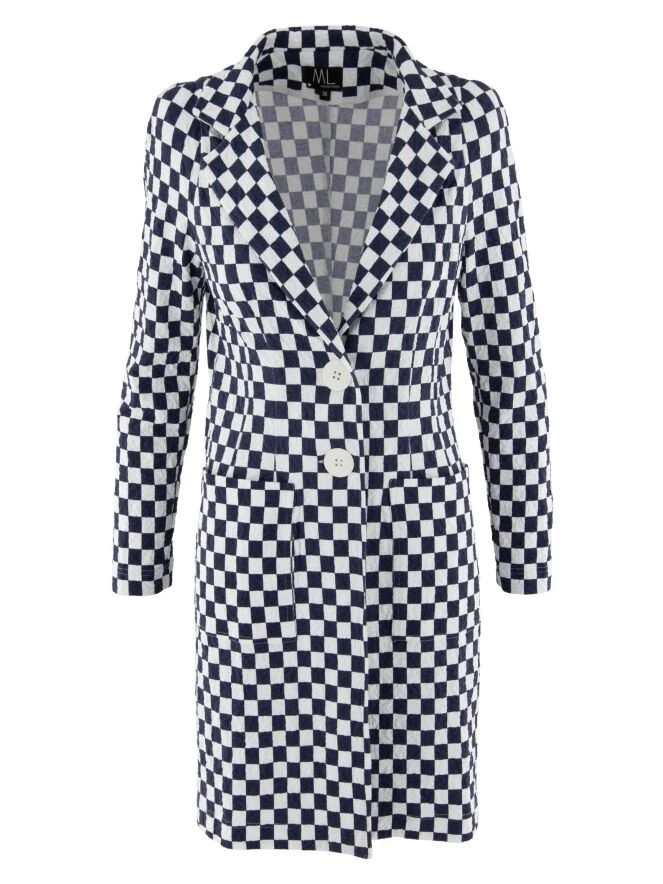 Ein langer Blazer von ML Collections in einem Blockdruck mit den Farben Marineblau und Weiß. Der Blazer hat einen Verschluss mit 3 Knöpfen und ist ungefüttert. Dieser Blazer darf nicht gewaschen werden.