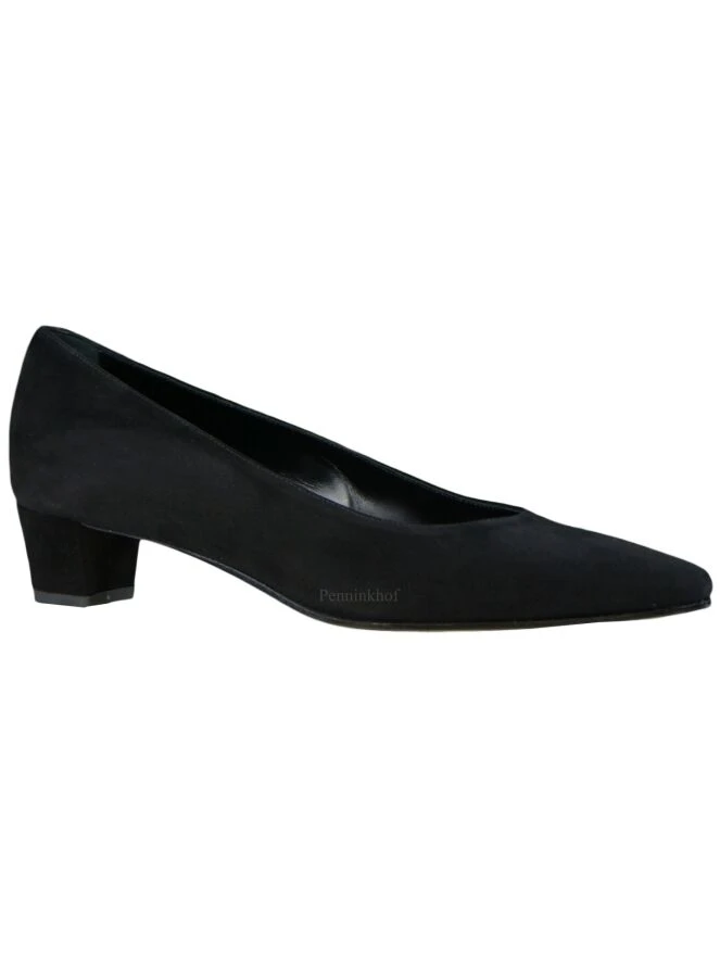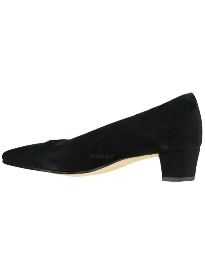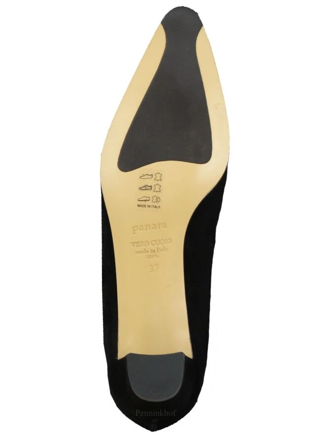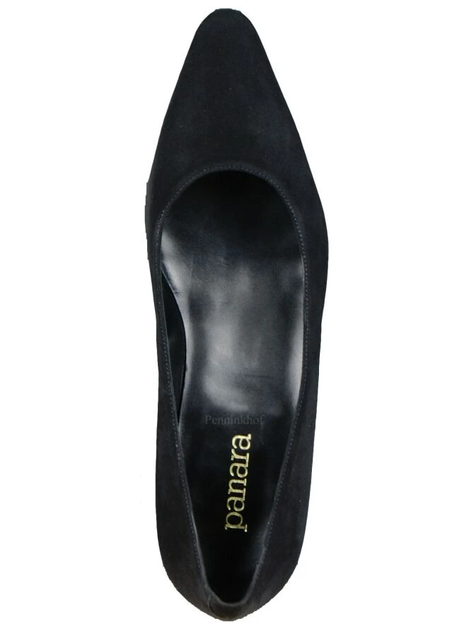 Ein Pumps der Schuhmarke Panara in Schwarz. Die Schuhspitze dieses Wildlederpumps ist schmal. Der elegante Absatz ist mit dem gleichen Wildleder bezogen. Die Innenseite des Pumps ist mit Leder ausgekleidet.