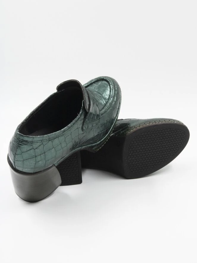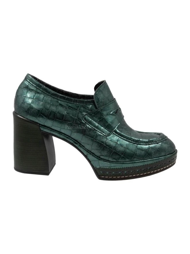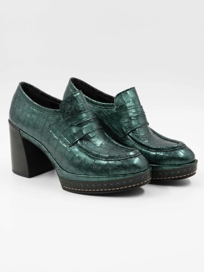 Ein Halbschuh mit hohem Blockabsatz von Pons Quintana mit Krokoprint in Metallic-Grün. Der Blockabsatz ist in einem neutralen Schwarz gehalten. Entlang der Kante an der Unterseite der Plateausohle befindet sich eine weiße Ziernaht. Die Innenseite ist mit Leder gefüttert.