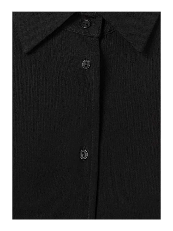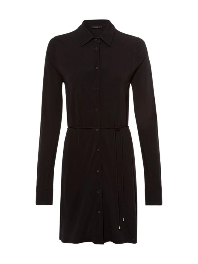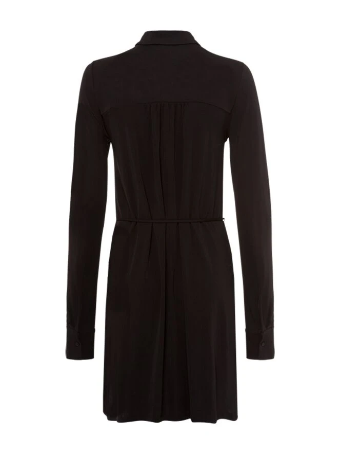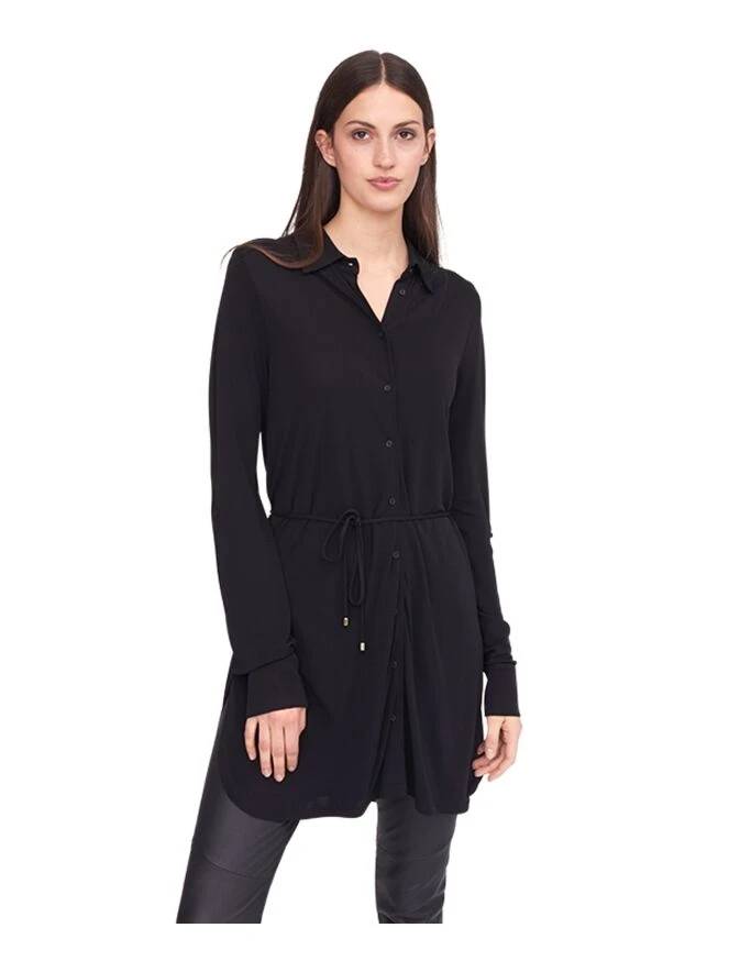 Eine schwarze Button-up-Tunika der Designermarke Riani. An der Taille befindet sich ein Schnurgürtel. Die langen Ärmel sind mit breiten Bündchen versehen. Diese Tunika kann bei 30 Grad gewaschen werden.