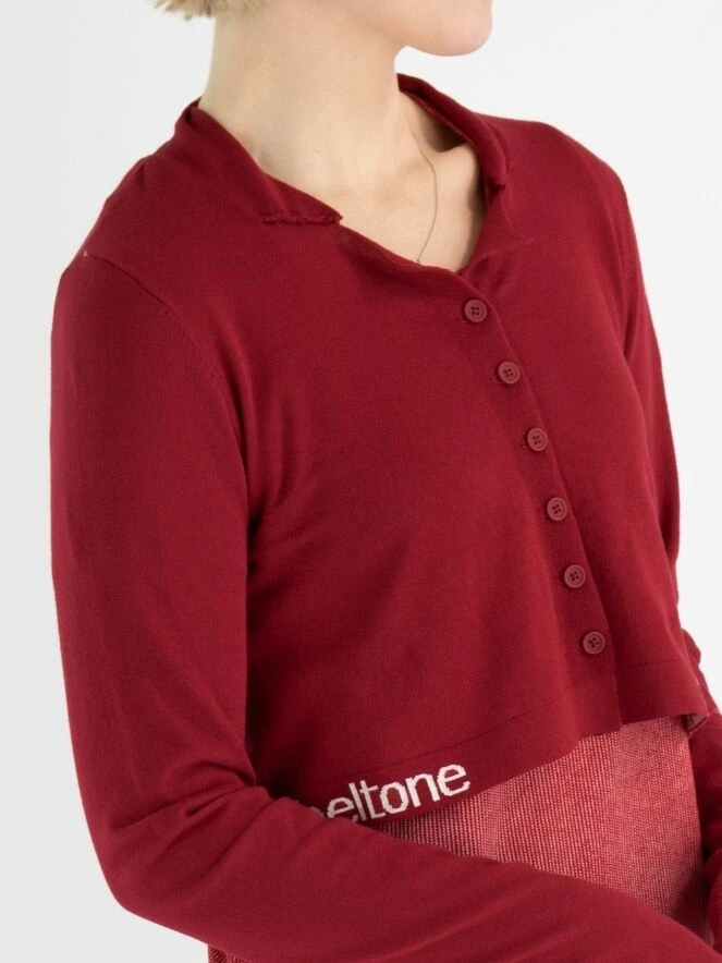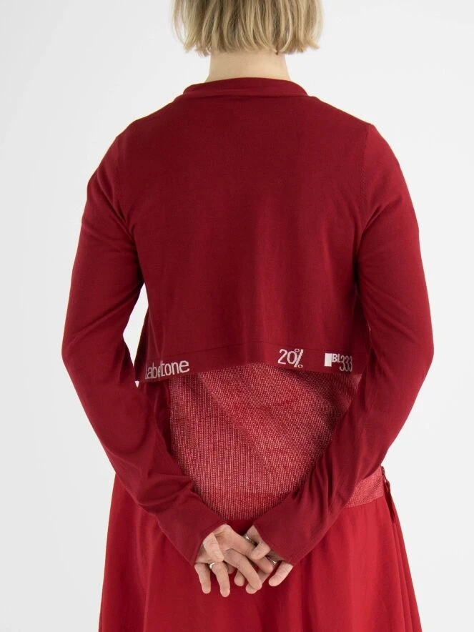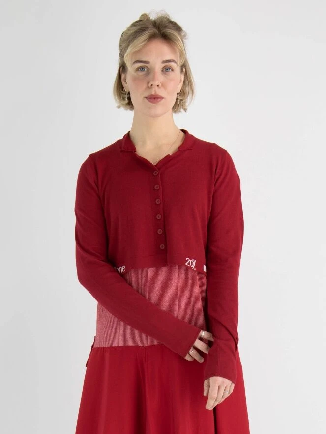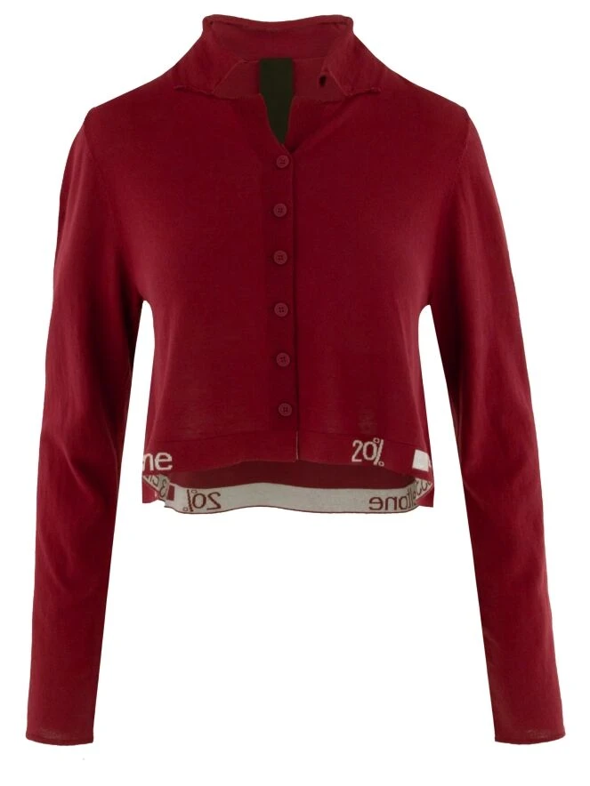 Ein kurzes Weste von Rundholz Black Label in Rot. Die Weste hat lange Ärmel, und am unteren Saum befindet sich ein weißer Buchstaben-Druck. Diese Weste kann bei 30 Grad gewaschen werden.