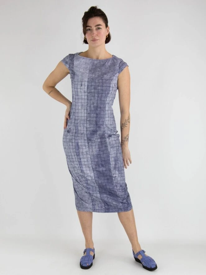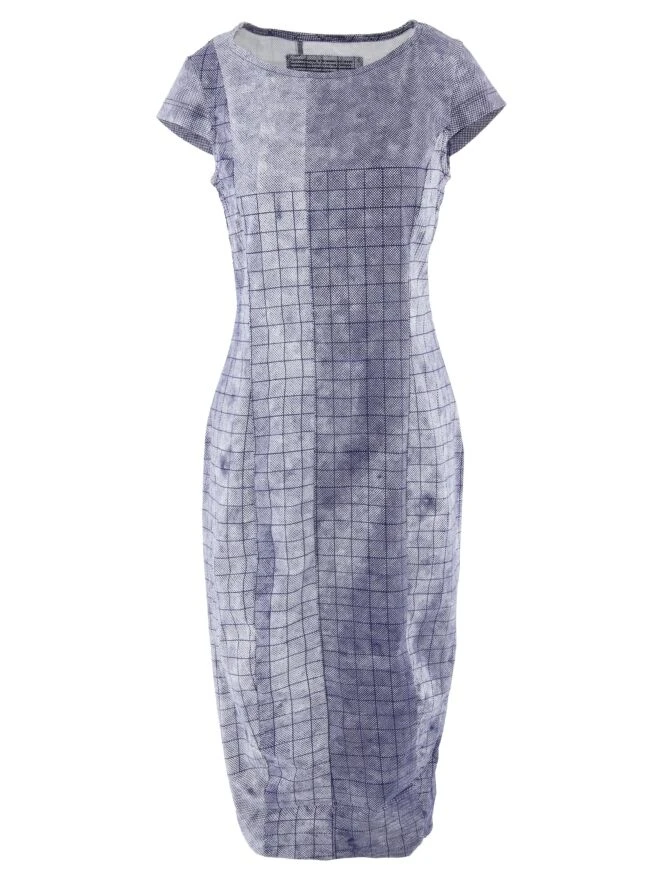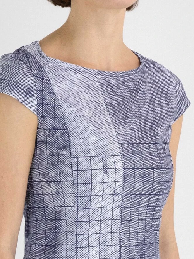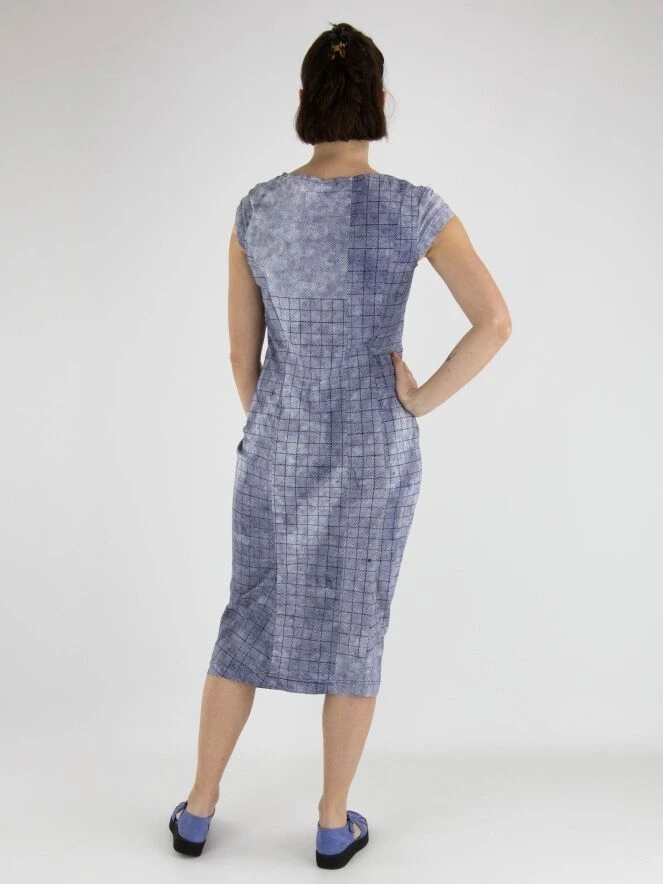Ein Kleid von Rundholz Black Label mit einem vielfältigen grafischen Rautenmuster in Indigoblau und Weiß. Das Kleid hat einen breiten Ausschnitt und kurze Ärmel. Dieses Kleid kann bei 30 Grad gewaschen werden.