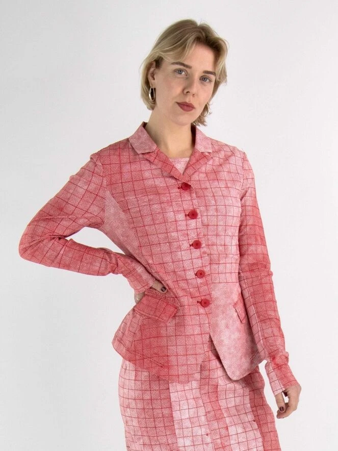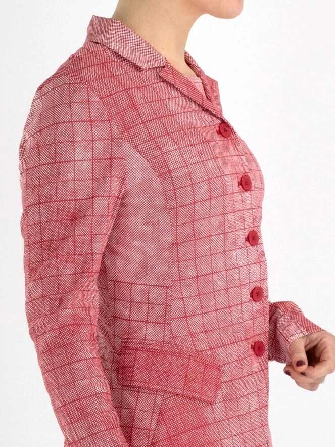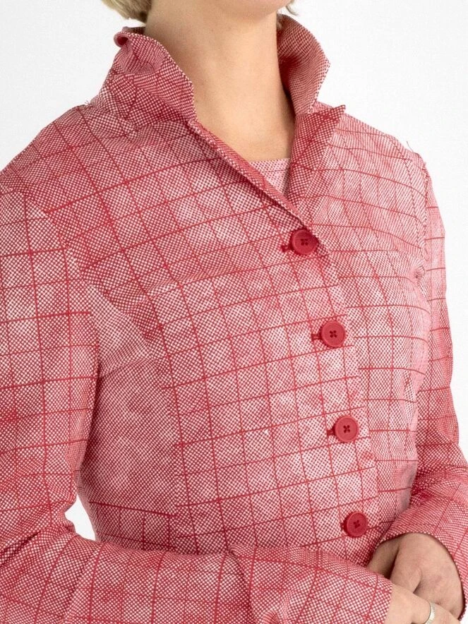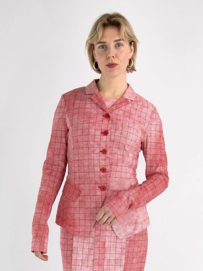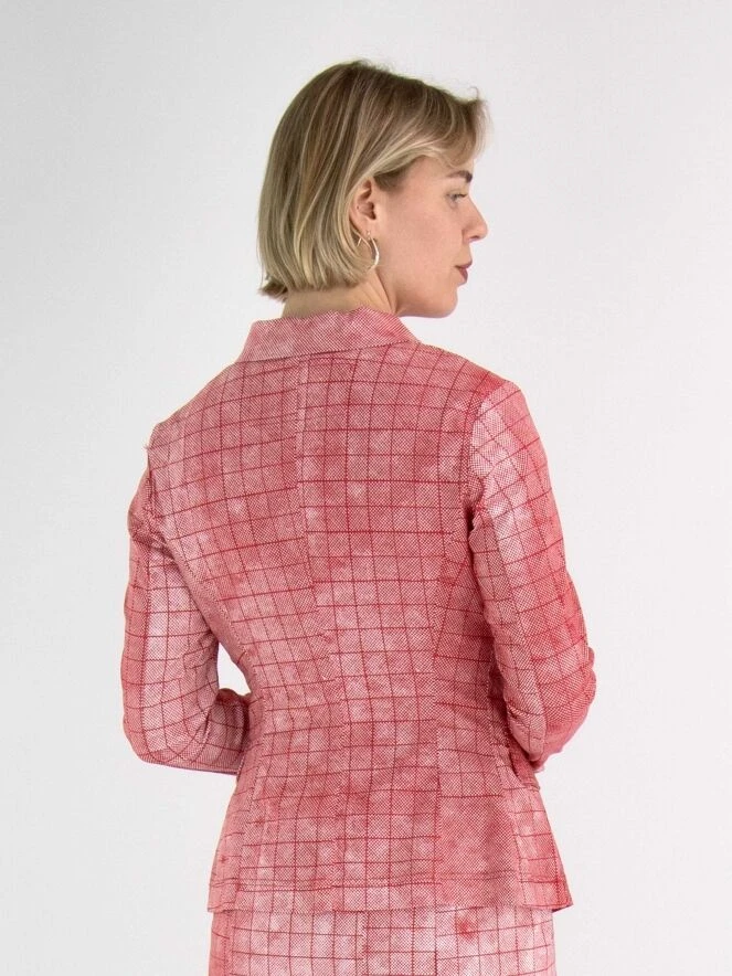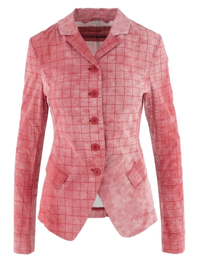 Ein Blazer von Rundholz Black Label in einem vielfältigen grafischen Karomuster mit den Farben Rot und Weiß. Der Blazer hat einen Verschluss mit 5 Knöpfen und ist ungefüttert. Dieser Blazer kann bei 30 Grad gewaschen werden.