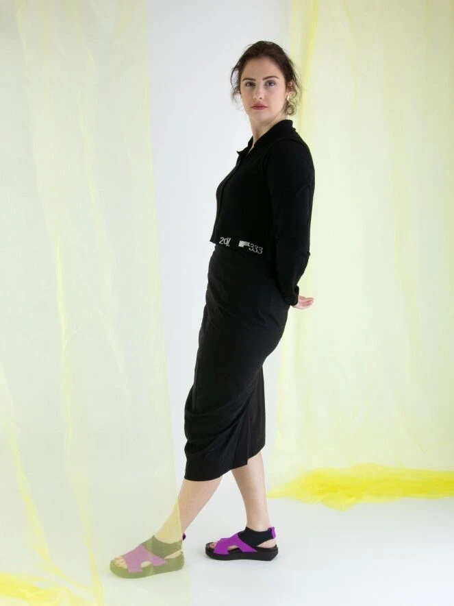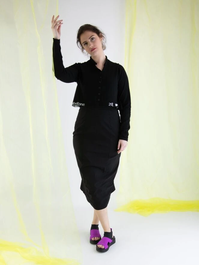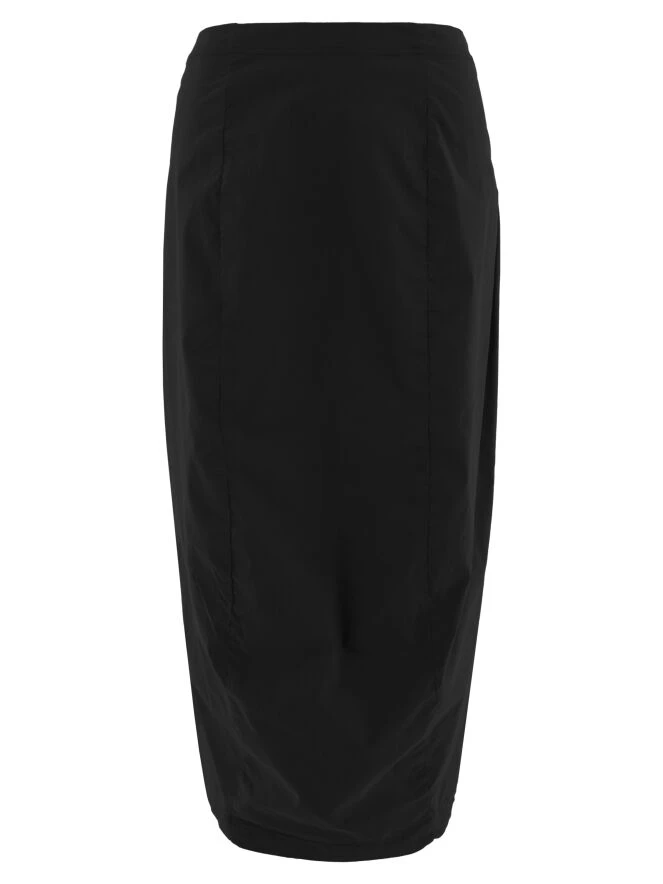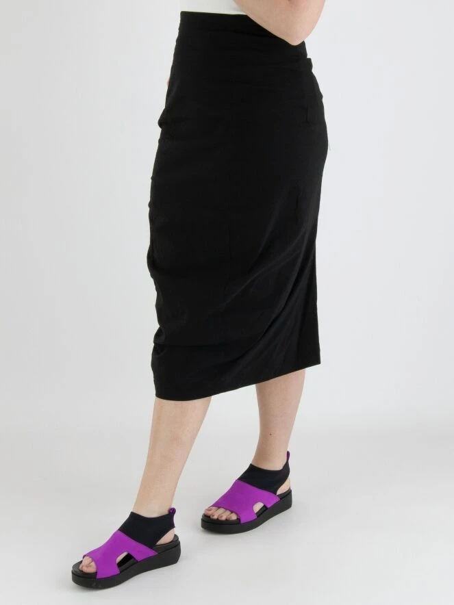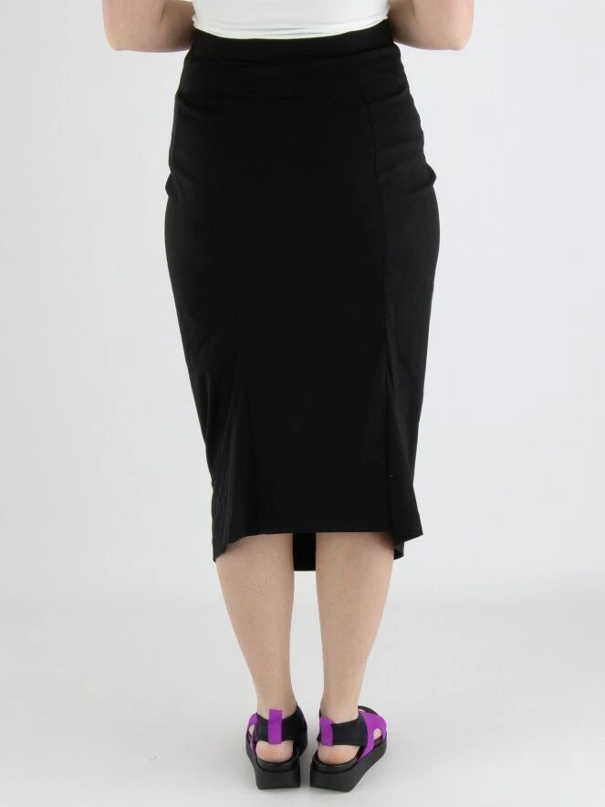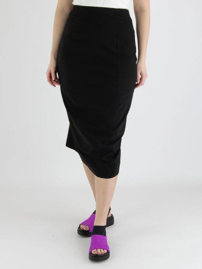 Ein Rock von Rundholz Black Label in Schwarz. Der Rock hat einen elastischen Bund. Er läuft nach unten hin schmal zu und ist ungefüttert. Dieser Rock kann bei 30 Grad gewaschen werden.