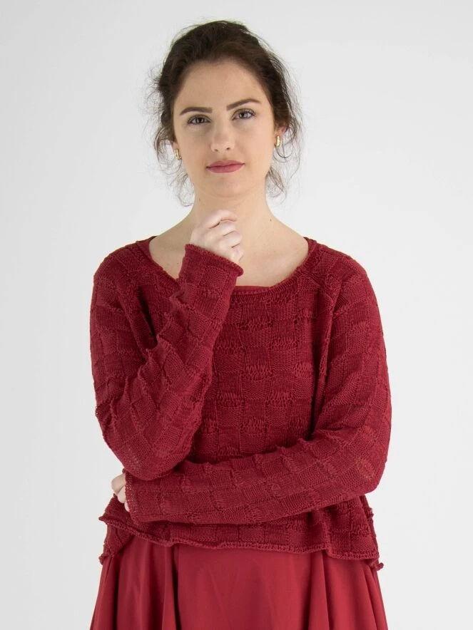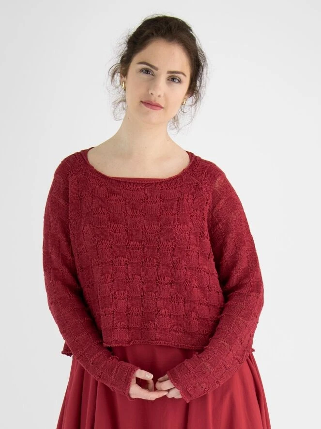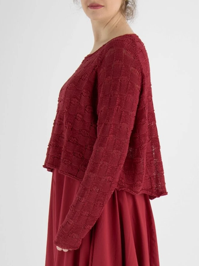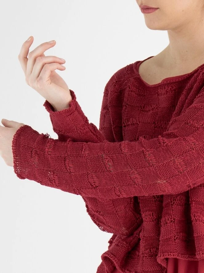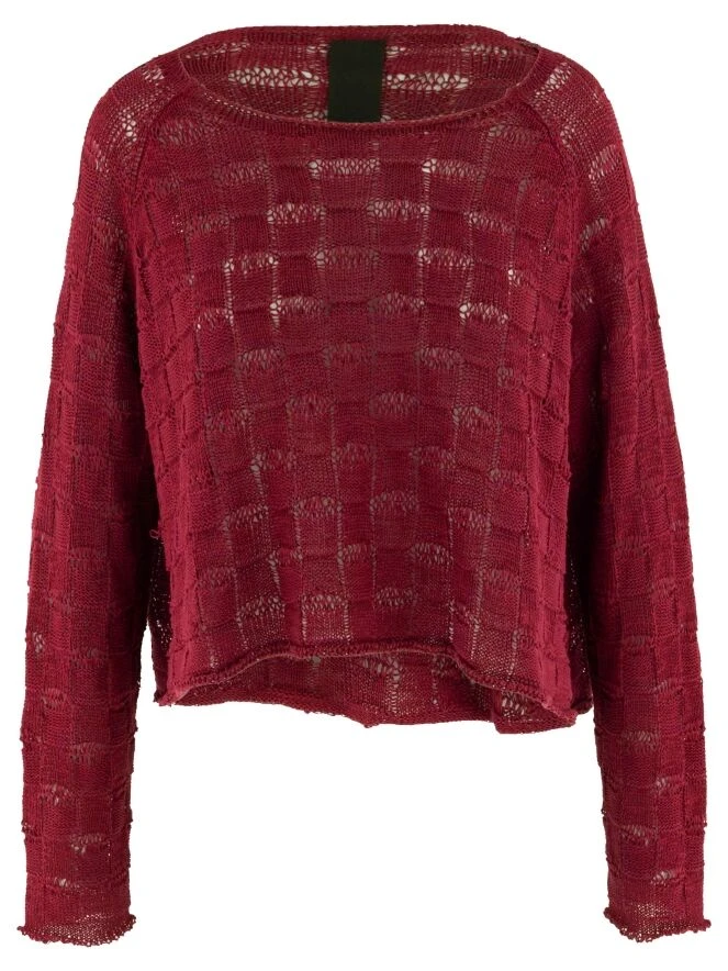 Ein offener Strickpullover von Rundholz Black Label in Rot. Der Pullover ist in einem Rautenmuster gestrickt. Er hat einen weiten Rundhalsausschnitt, lange Ärmel und kann von Hand gewaschen werden.